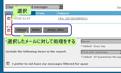 ここでは、フィルタリングにより配信を中止し、フィルタサーバに保管されたメールを見ることが出来ます。