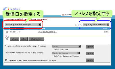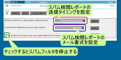 リストの下のフォームでは、スパムフィルタの動作を設定することができます。設定変更し、各設定の右の『Update』をクリックすると、変更が反映されます。| ・ | All Quarantined Message | - | 配信停止した全てのメールを掲載します。 |