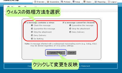 『Anti-Virus』では、ウィルスフィルタの動作を設定することが出来ます。| ・ | Clean the message | - | ウィルスに感染した添付ファイルからウィルスのみ削除を試みます。 |