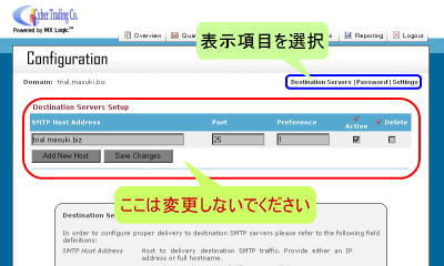 また、最初に表示される『Destination Servers』は、設定を変更するとメールの配信が正常に行えなくなるので、変更しないでください。