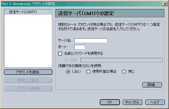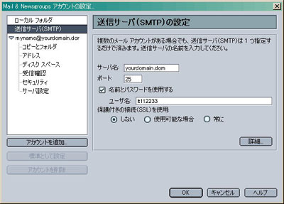 画面カ枠の「送信サーバ(SMTP)」をクリックし、上記を参考に設定します。 「OK」をクリックします。