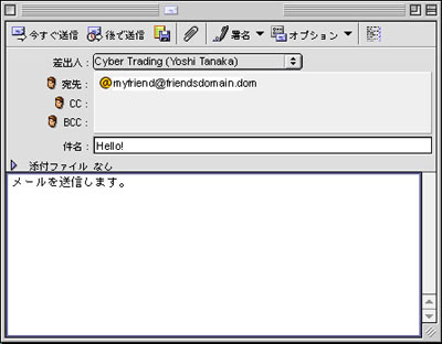 テストメールを送信する場合は、「宛先」へ自分のメールアドレスを設定し送信します。 次に受信作業を行い、テストメールを受信していれば、成功です。