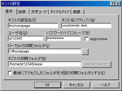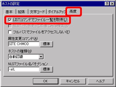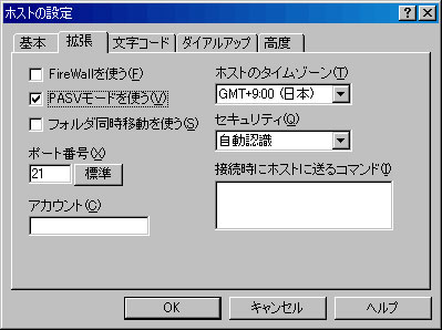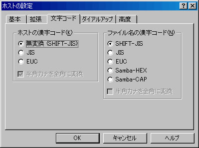 ルーターを利用されている環境(例:ルータータイプのADSLモデム利用)でFTPを行う場合は、PASVモードを使うにチェックを入れ設定してください。 その他項目は特に設定を変更する必要はありません。 次に「文字コード」タブをクリックします。
