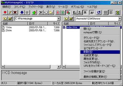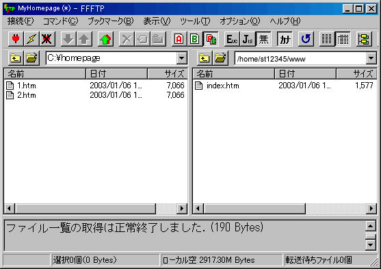上向き矢印のボタンをクリックすると、パソコンからサーバへファイルの転送が行われます。