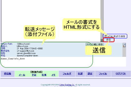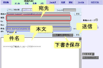 転送メールの編集中は、メール本文の入力欄の下に元メールの内容が表示されます。この画面では、この元メール以外のファイルやメールを添付することはできません。