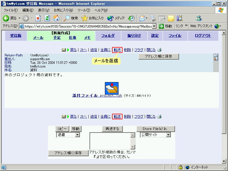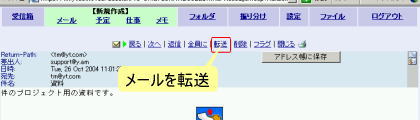 メールを転送するには、メール文の上方にある『転送』をクリックします。
