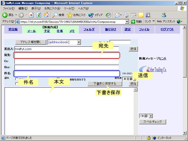 メールを新規作成するには、ページ上方のナビゲーションバーの『【新規作成】メール』をクリックします。