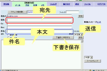 時間が無いなどの理由で、送信できるようになるまでメールを編集しきれない場合は、『下書きに保存する』をクリックすると、編集中のメールを下書きフォルダに保存できます。保存した下書きはあとで再編集することができます。