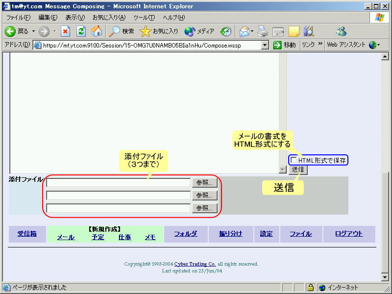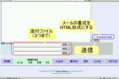 ページ下方には、添付ファイルを設定するフォームや、メールをHTML形式で送信するチェックボックスもあります。