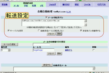 入力を終えたら『更新』ボタンをクリックすると、それ以降に受信したメールを転送するようになります。