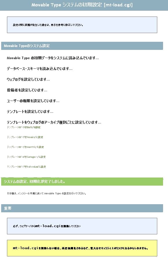 Movable Type の初期化を行います。 Webブラウザを使って、http://yourname.dom/mt/mt-load.cgi