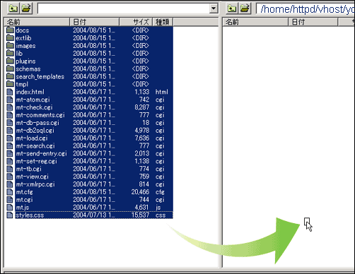 アップロードするファイルは、展開したパッケージに含まれるすべてのファイルになります。たくさんのファイルを一度にアップロードするため、FFFTP