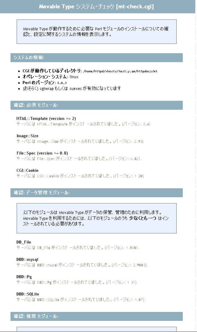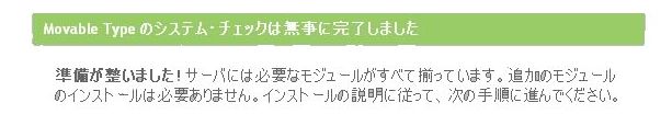 『 Movable Type のシステム・チェックは無事に完了しました』 という文章がページの最後の方に表示されれば、成功です。