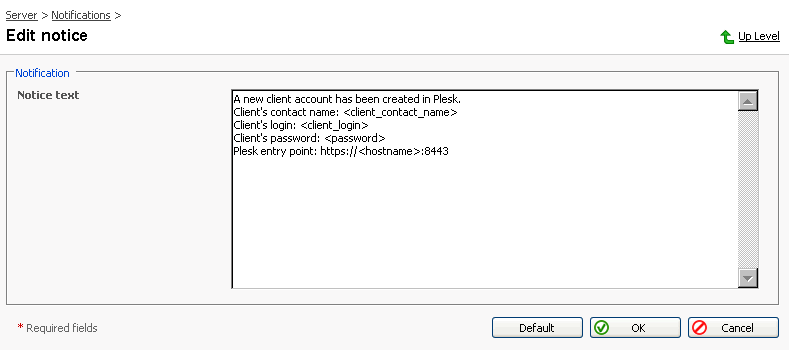 デフォルトの通知テキストを使用する場合は、[デフォルト]をクリックください。または、通知テキストを編集し、