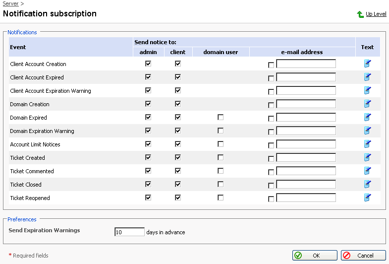 有効期限切れ警告を有効にするには、該当するフィールドに数値を指定してください。期限切れ警告はドメインもしくはクライアントアカウントの有効期限が切れる日の入力した日数分前に1回だけメッセージを送信します。