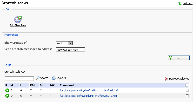 [クローンタブを表示:]ドロップダウンボックスは現在表示されているスケジュールされたタスクが所属するシステムユーザを表します。他のシステムユーザを選択すると、そのユーザに属するスケジュールタスクを閲覧、管理することができます。