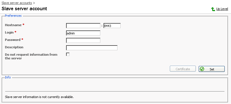 適切なフィールドにホスト名、ポート番号と、Pleskがスレーブサーバにログインする際に使用するログイン名、パスワードを入力してください。スレーブサーバの説明を入力することもできます。スレーブサーバの詳細な情報を取得しない場合は、[スレーブサーバに情報をリクエストしない]チェックボックスをチェックしてください。