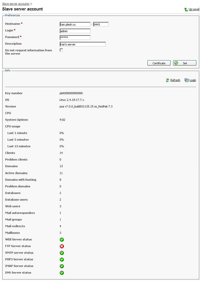 スレーブサーバにログインするには、[ログイン]をクリックしてください。リモートスレーブサーバのPleskコントロールパネルが新しいブラウザウィンドウで開きます。