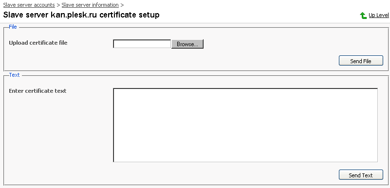 証明書の内容は適切なフィールドにコピーアンドペーストすることも、シンプルに[参照…]ボタンを使って指定することもできます。次に[ファイル送信]もしくは[テキスト送信]ボタンをクリックして証明書を送信してください。[上へ]ボタンをクリックすると、変更を破棄して、スレーブサーバアカウントページに戻ります。