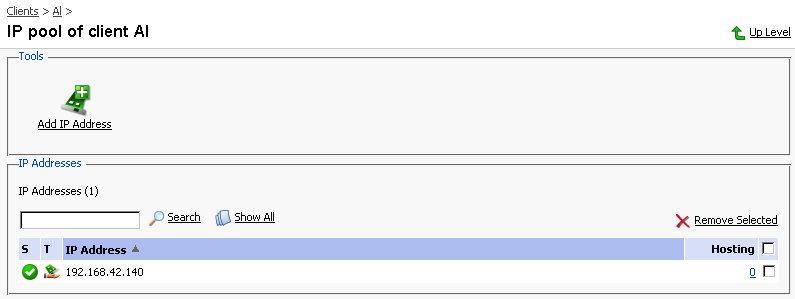 (IPプール)アイコンをクリックしてクライアントIPプールにアクセスしてください。そのクライアントに許可されている(専用または共用)IPアドレスのリストが表示されます: