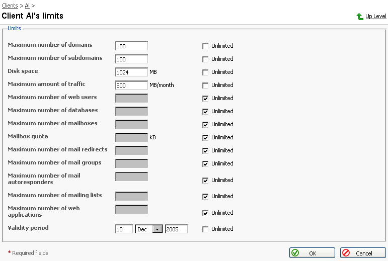さまざまなタスクをPleskで実行している間、クライアントはリソースを使用しています。各クライアントについてリソース使用を制限できます。クライアントのリソース制限を編集するには: