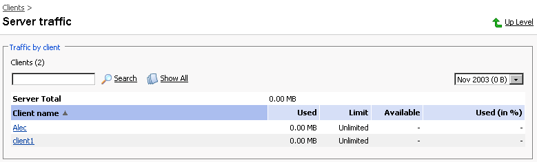 すべてのクライアントによって使用された、サーバの総トラフィック量情報を閲覧するには、次のステップで行ってください: