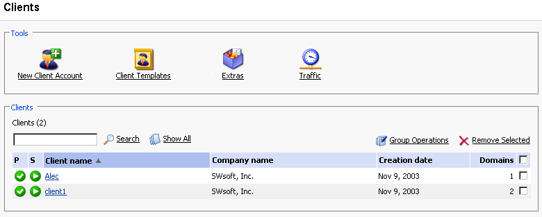 同じ変更を複数のクライアントアカウントに適用したい場合は、一括操作機能を使用することができます。これにより複数アカウントの管理が簡略化されます。この機能を使用すると、例えば、複数のクライアントに作成できるドメイン数の制限がたったの1つの操作 - クライアントの選択と設定を除けば - で行うことができます。
