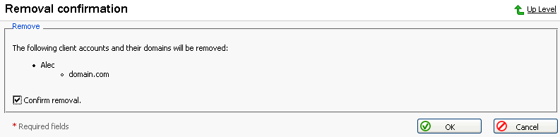 削除を確認するチェックボックスをチェックして、[OK]をクリックしてください。クライアントアカウントの削除を取りやめる場合は、[キャンセル]ボタンをクリックしてください。