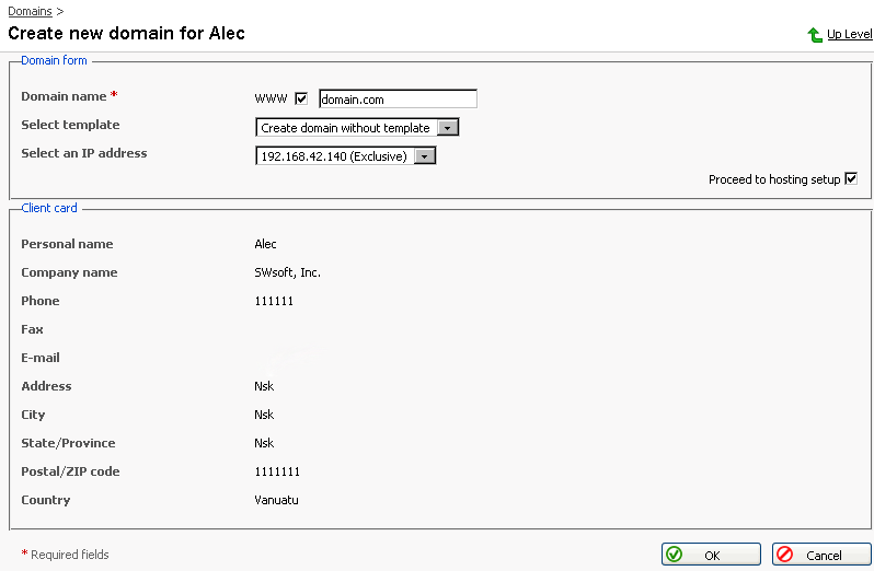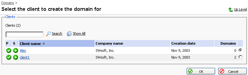 ラジオボタンを使用して、ドメインを作成するクライアントを選択して、[OK]をクリックしてください。ドメイン作成ページが開きます: