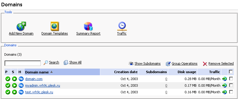 ドメインはインターネットURLアドレスによって識別されます。構文的には、ドメイン名は単語もしくは文字がピリオドで区切られている文字列です。例えばwww.sw-soft.comはSWsoftの情報が置かれているサーバのドメインの名前です。ドメインは1つのクライアントに所属するものです。例えば、aceprogrammer.comというドメインはJohn Doeというプログラマーに所有されます。ABCDE, Inc.カンパニーはabcde.comという独自のドメインをもつでしょう。すべてのドメインはクライアントに割りあてられるのです。