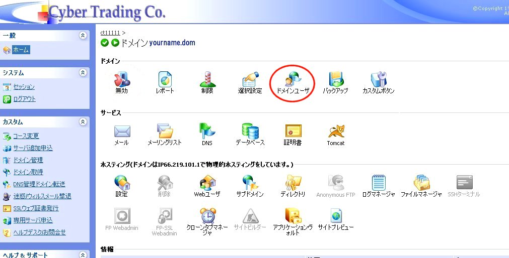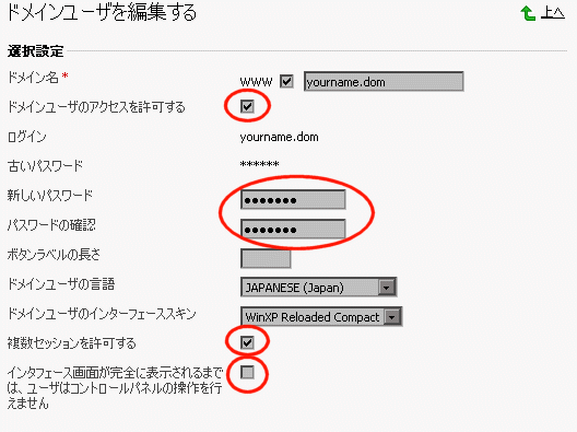 これで、コンパネにドメイン名と上記で設定したパスワードにてログインでき、ドメインユーザが、自分のドメインのみを管理できるようになります。 |