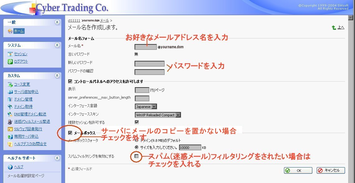 POPメールアカウント  : お客様がご自身で設定できます。