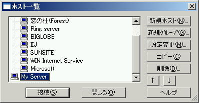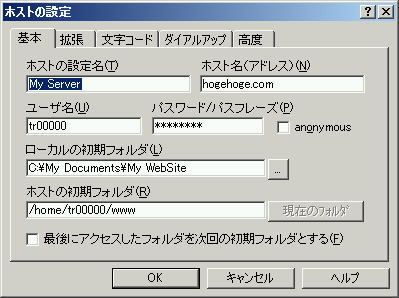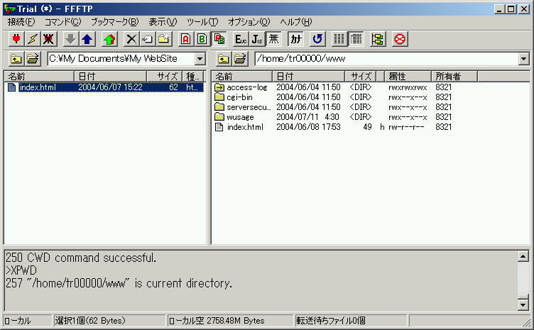 ウェブ公開の方法設定完了のメールが届けば、ご希望のドメイン名でウェブサイトを公開することができます。メールにございますURLを、ブラウザに入力してアクセスしてみましょう。 最初は下ような、味も素っ気も無い仮のページが置かれています。 ※これが表示されない場合、DNSなどの設定に不備がある、情報が浸透しきっていない、などの理由でドメインをまだご利用いただけません。IPアドレスで http://(IPアドレス) と入力してこれが表示されれば、サーバの利用はできます。 さて、頑張って作った自分のウェブサイトをこのサーバで公開するには、FTPでサーバにファイルを送信(アップロード)します。 当ページでは、 曽田純様作のFTPクライアント FFFTP を例に解説いたします。インストール方法は、サイトのほうに詳しいマニュアルがございますので、ここでは割愛いたします。 ![]() インストールが完了して初めて起動すると、このような画面が表示されます。 まずは『新規ホスト』をクリックして、サーバの設定を作成します。設定完了の通知(マニュアル)をご用意ください。 『ホストの設定名』には、好きな名前をつけることができます。わかりやすい名前をつけてください。『ホスト名(アドレス)』にはドメイン名を入れます(例では hogehoge.com となっています)。 もしドメイン名で接続できない場合は、ドメイン名の変わりにIPアドレスを入力します。 『ユーザ名』にはメールにございますアカウント(例では tr00000)を、パスワードには申し込み時に入力したパスワードを入れます。 ※パスワードは、他人にパスワードを覗き見されないために、何を入力しても * と表示されます。 『ローカルの初期フォルダ』には、作成したウェブページが保存してあるフォルダを選択してください。index.html があるフォルダを選ぶといいでしょう。 『ホストの初期フォルダ』には、 /home/(アカウント)/www と入れておきましょう。 こうすれば、サーバに接続してすぐにファイルをアップロードできます。 入力したら『OK』を押します。 ![]() 一覧の一番下に、『設定名』でつけた名前の設定が表示されているはずです。 これを選択してクリックすれば、サーバへ接続することができます。 ![]() 左側に表示されているのが自分のパソコンのファイル、右側がサーバに置かれているファイルです。 サーバファイルをアップロードするには、アップロードするファイルを左から選択し、 逆にサーバのファイルを選んで 送るファイルを間違えたり、公開を取りやめたいファイルができて、削除したい場合は、削除したいファイルを右クリックで選択します。メニューが現れるので『削除』を選択すると、ファイルを削除することができます。※access-log、cgi-bin、serversecure、wusageのフォルダは、管理サイトの表示やメールの保存などに使用しておりますので、削除や名称の変更をなさらないで下さい。 また、サーバにあるファイルの名前を変更したり、フォルダを作成したい場合も、同様に『名前変更』や『フォルダ作成』を選択すると、名前を入力してファイル名の変更やフォルダ作成をすることが可能です。 ※cgi-bin、siteadmin、personalなどのフォルダ名は、システムが使用しているためご利用いただけません。 ※Windowsと違い、サーバ上ではファイル名の小文字と大文字は区別されます。index.htmlとIndex.html、INDEX.HTMLは全て違うファイルになりますのでご注意ください。 これで、独自のホームページを公開していただけるはずです。 最後にひとつだけ。 トライアルコースでは、利用できるファイル容量が1MBしかありません。これは、ちょっと重い画像やサウンドファイルなどを用いると簡単に埋まってしまう程度の容量です。注意していなければ、すぐに容量いっぱいになってFTPのアクセスが利用できなくなってしまいます。 サーバのファイルを右クリックするメニューに『ファイル容量計算』というものがありますので、すべてのファイルを選択してこれを行うと、サーバに置いたデータの総容量がわかります。 まったく正確な容量がわかるわけではないのですが、使用量の目安にしてみてください。