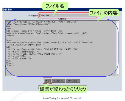 編集が完了したら『保存』をクリックするとファイルを保存します。『キャンセル』をクリックすると変更を破棄してファイル一覧に戻ります。