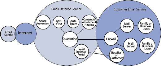 当サービスでは、利用者の企業内や利用者のサーバ内のメールホストへメールを配信する際のプロキシゲートウェイを構築しています。処理サーバ内ではメールメッセージの受理を実際には認知しません。その代わり、SMTPとしてメールトラフィックを受理し、受信者のメールサーバへ即座に接続配信をします。次いでメールメッセージは、受信者のSMTPサーバへ配信する前段階で多重構造のフィルタリングへと通されます。一旦、受信者SMTPサーバがメール受信の受理を検知すると、メッセージ受理の信号が元もとの送信者のSMTPサーバへ返されます。正当なメールメッセージは、ネットワークの流れの中での環境下にて処理され、いずれのハードディスクにも蓄積されることはありません。