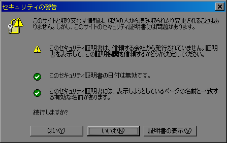 しかし、その場合、SSLサイトにユーザーがアクセスしてきた以下のダイアログが表示されます。