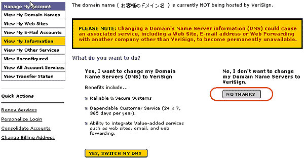 - NO THANKS をクリックします。※ YES,SWITCH MY DNS はクリックしないでください。